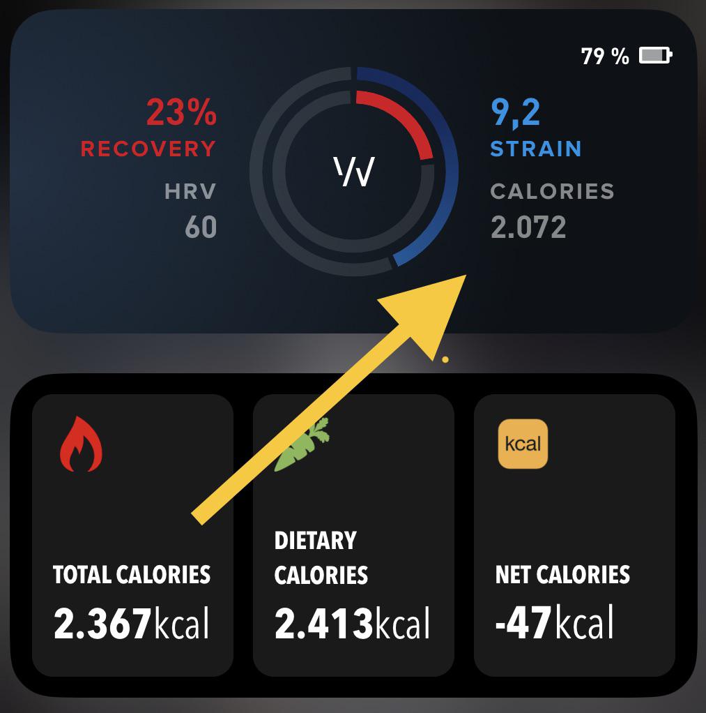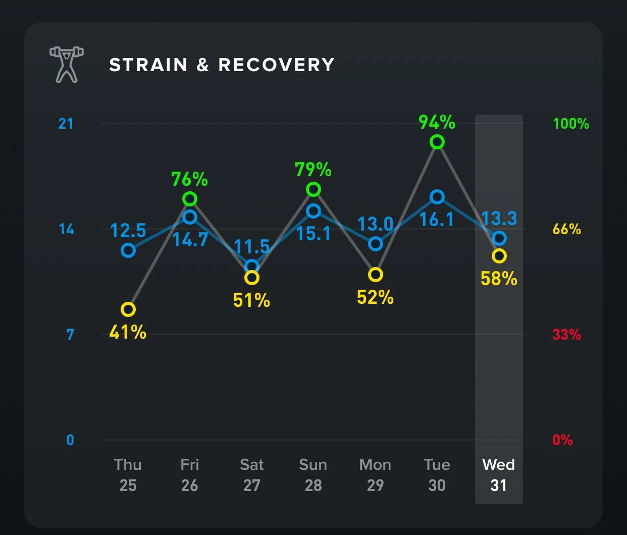 Показывает, насколько каждая тренировка нагружает тело. Например, можно увидеть, что после силовой сессии в обед допустимо сделать лёгкий вечерний бег без риска перетренироваться. Однако важно помнить: эти данные — инструмент, а не приговор. Могут быть дни, когда whoop будет показывать отличное восстановление, но вы будете плохо себя чувствовать, поэтому важно прислушиваться в том числе к себе и своему организму.