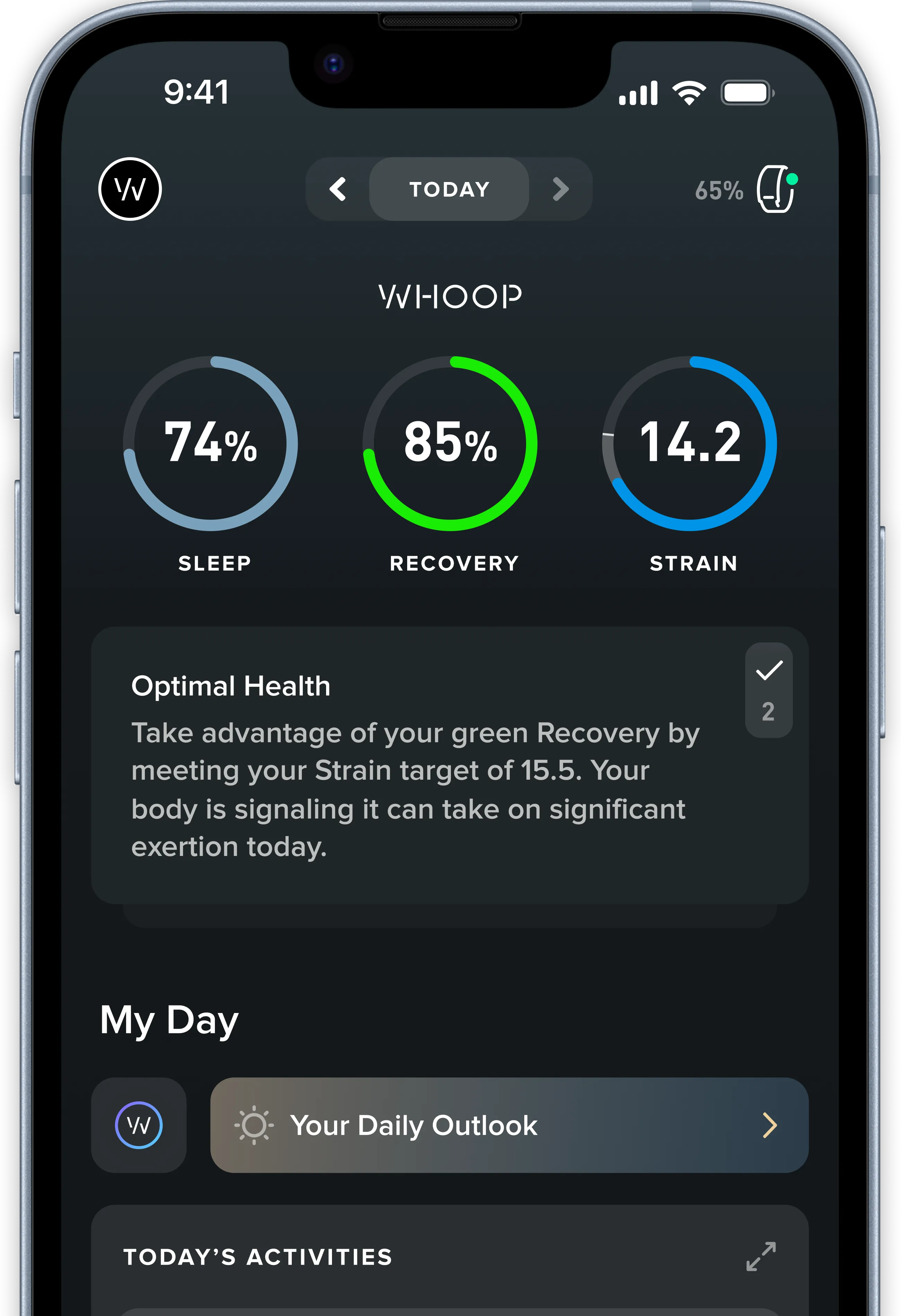 Показатель восстановления WHOOP формируется на основе сна, вариабельности сердечного ритма (HRV), пульса в покое (RHR) и частоты дыхания. Каждый день устройство объясняет, почему вы получили тот или иной балл. Например, высокий показатель может быть результатом хорошего сна, что означает — организм готов к интенсивной нагрузке. Диапазон оценок