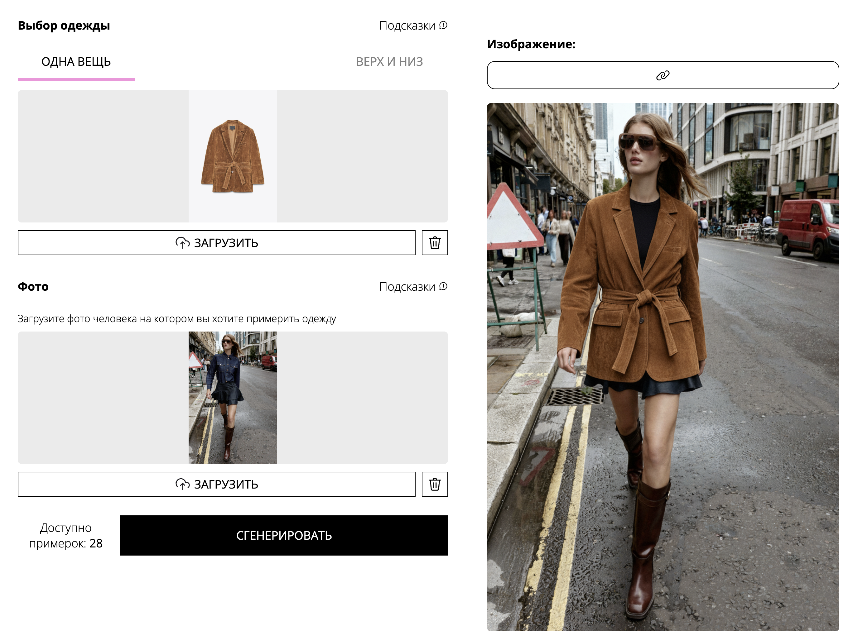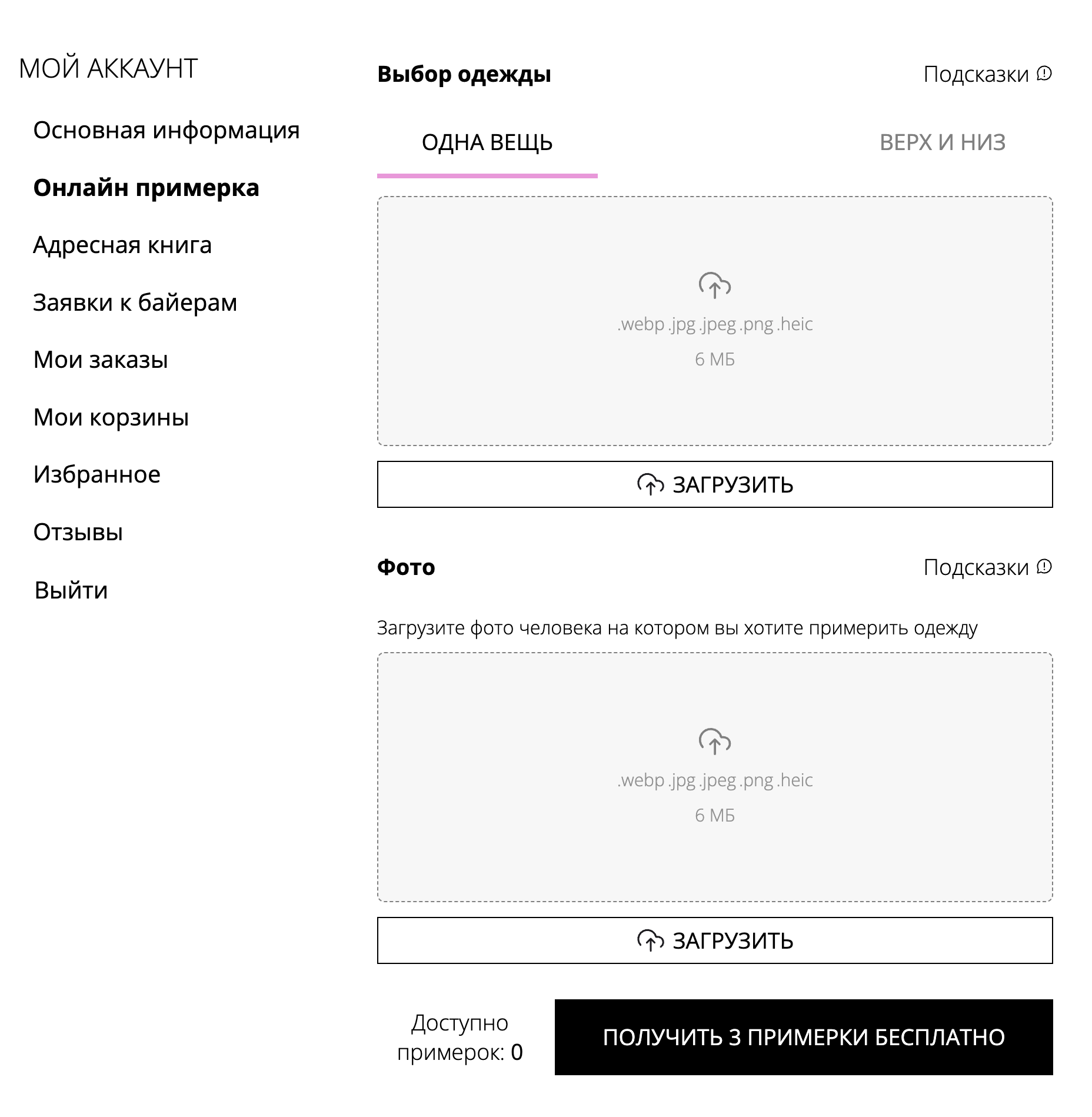 Чтобы попробовать любую вещь к примерке, загрузите ее. А так же загрузите свою фотографию. Чтобы примерка получилась качественной, следуйте подсказкам, которые вынесены на страницы. Посмотреть их можно кликнув на кнопку "Подсказки"